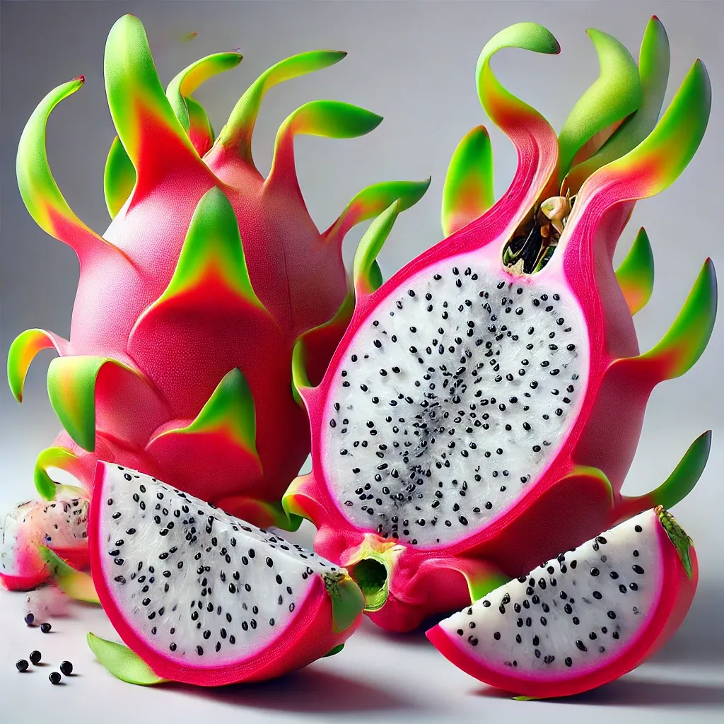 드래곤 프루트는 선인장 과일로, 주로 중남미에서 자생하며 피타야(pitaya)라는 이름으로도 불립니다. 과일의 외형은 붉은색 또는 노란색 껍질에 초록색 비늘이 있는 용을 연상시키는 독특한 모양으로, 이로 인해 '드래곤 프루트'라는 이름이 붙었습니다. 과육은 흰색 또는 붉은색으로, 작은 검은 씨앗이 산재해 있어 키위와 유사한 텍스처를 가집니다. 드래곤 프루트는 항산화 물질이 풍부하며, 비타민 C, 칼슘, 마그네슘, 철분 등의 중요한 영양소를 포함하고 있습니다. 또한, 칼로리가 낮고 섬유질이 풍부하여 체중 관리와 소화 건강에 도움을 줍니다. 이 외에도 드래곤 프루트는 피부 건강, 면역력 강화, 혈당 조절 등 다양한 건강 혜택을 제공합니다.